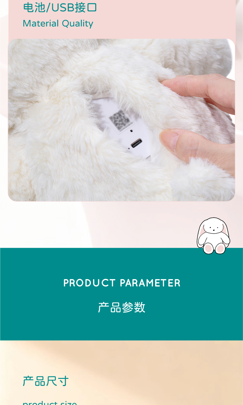 材质:兔毛、100%PP棉填充、硅胶爪、硅胶鼻、加重胶粒。